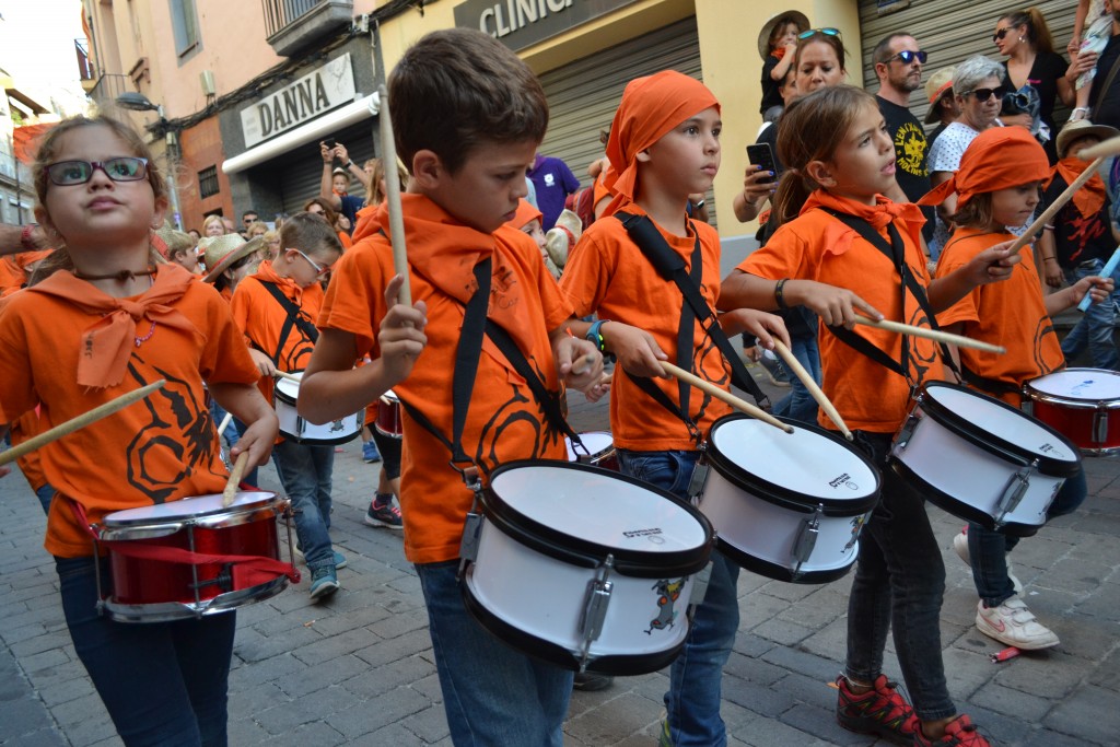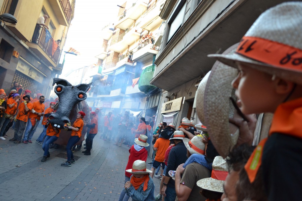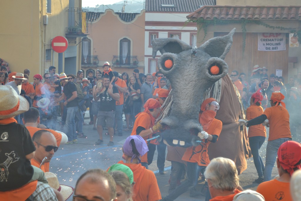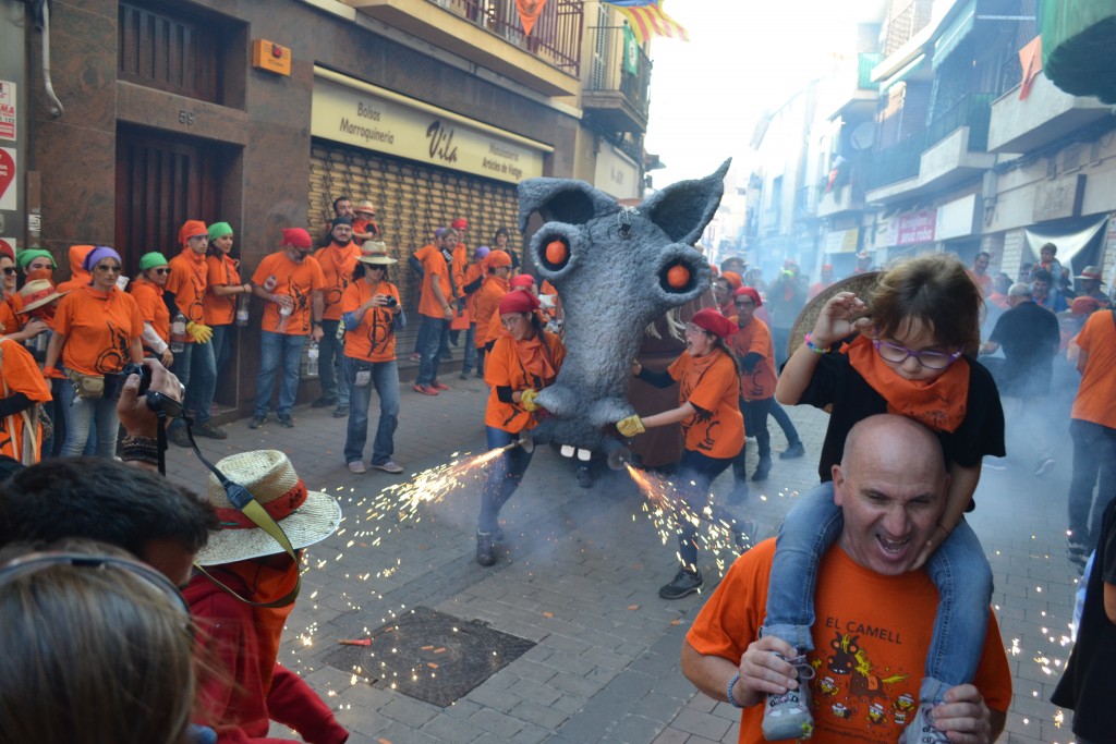 Correfoc de bateig. Aquest dissabte a la tarda molts petits de Molins de Rei han pogut gaudir per primera vegada del Camell encès, però a baixa intensitat. Si bé la bèstia de foc ha empaitat a les famílies pels carrers del centre de la vila, la idea s’ha centrat sobretot a familiaritzar als menuts amb un dels símbols de la Festa Major.